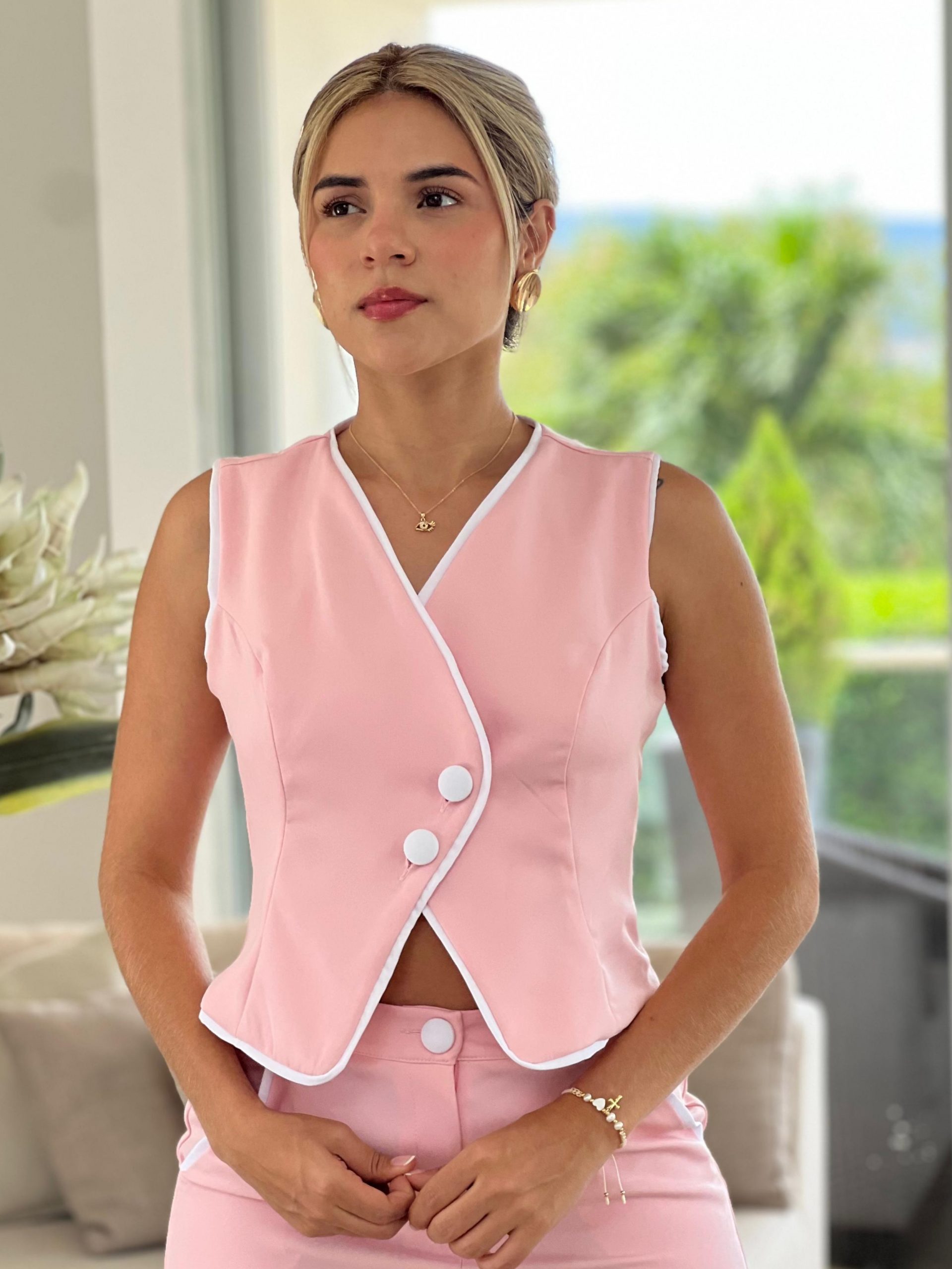 Chaleco corto siso con botones forrados con sesgos y corte princesa en delantero y posterior