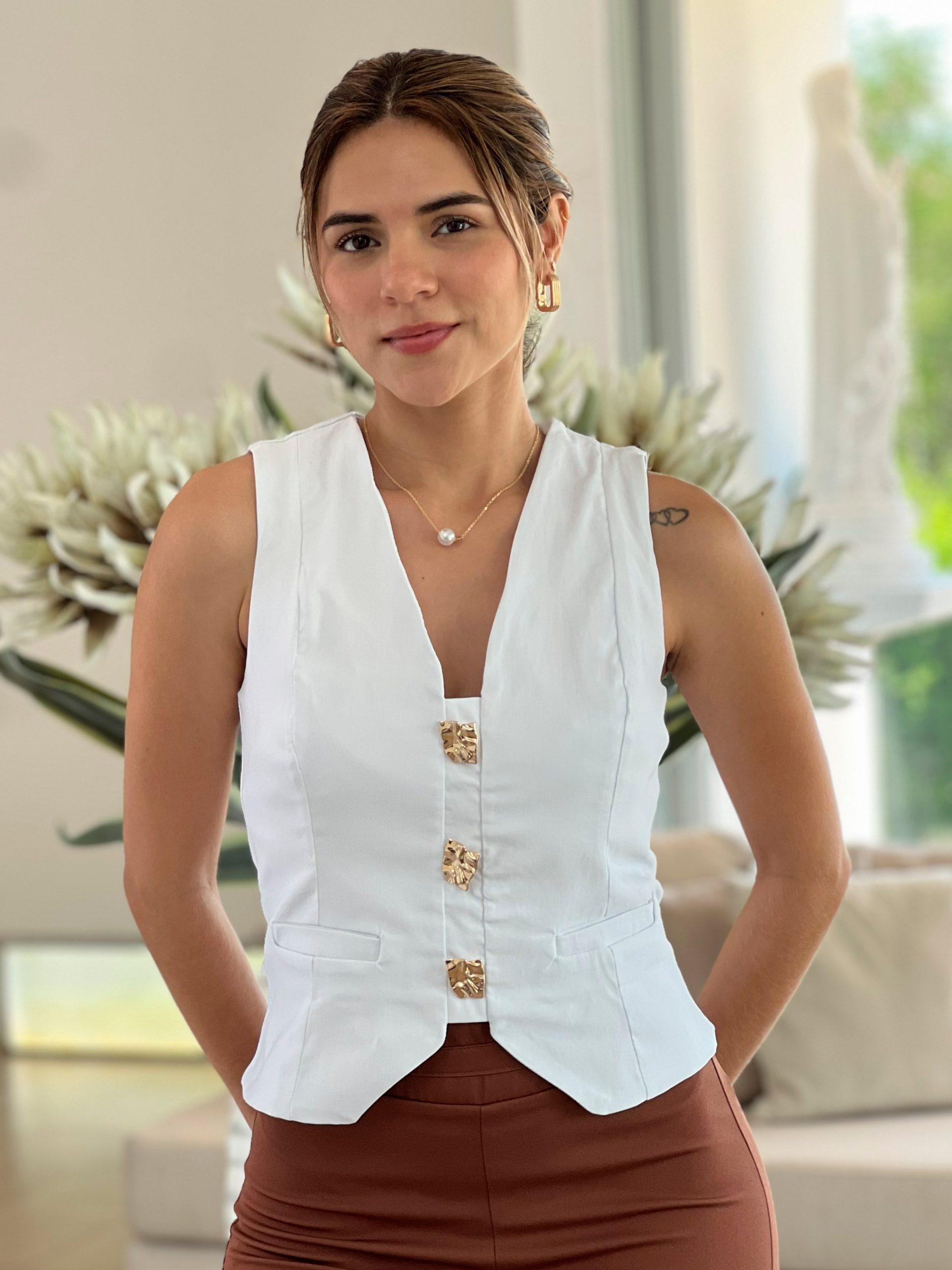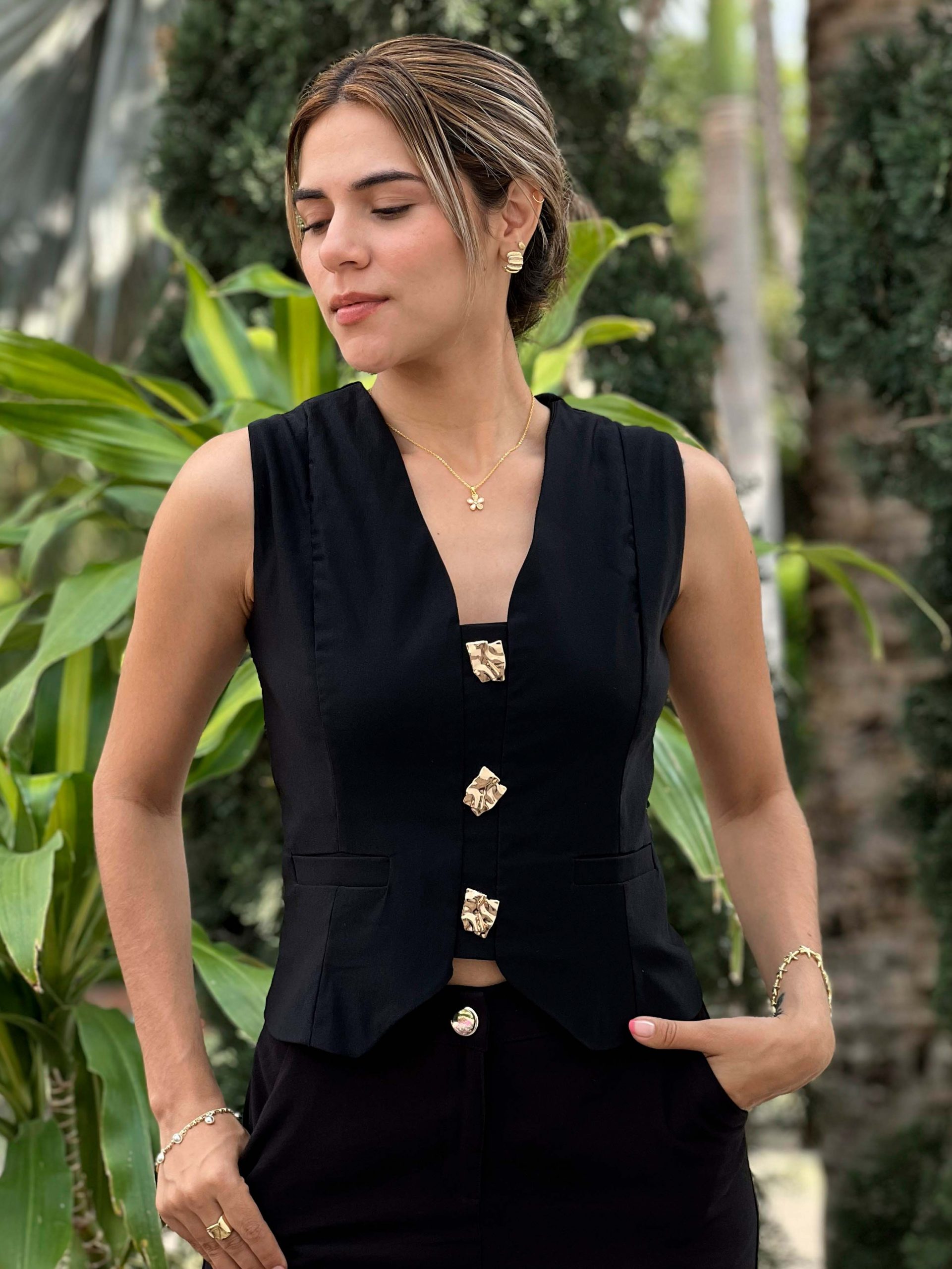 Chaleco siso con botones dorados que elevan cualquier look. Elegante, versátil y fácil de combinar, perfecto para  darle un toque chic a tus outfits del día a la noche.