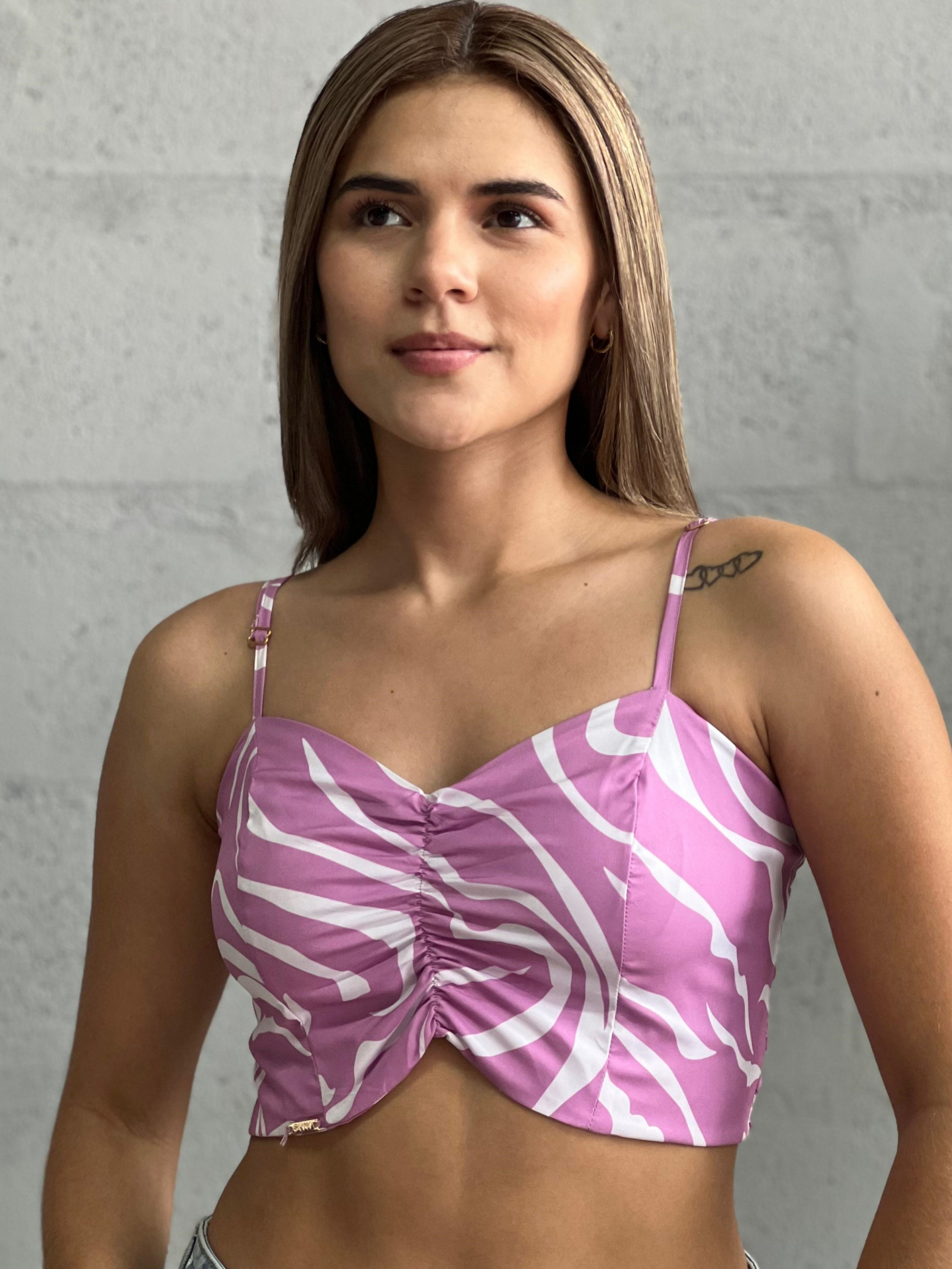 CROP TOP ESTAMPADO EN TIRAS CON ELONCACION EN LA ESPALDA
