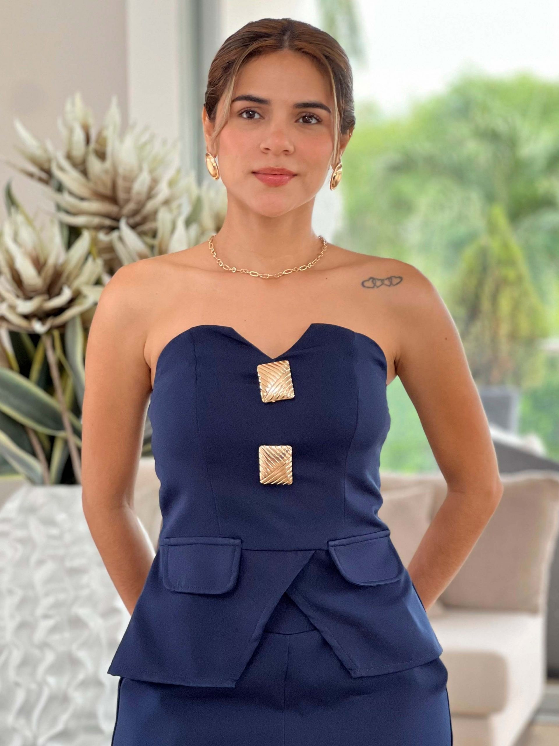 CROPTOP ESTRAPLE CON ABERTURA EN V CON TAPAS SIMULANDO BOLSILLOS Y CIERRE ATRAS