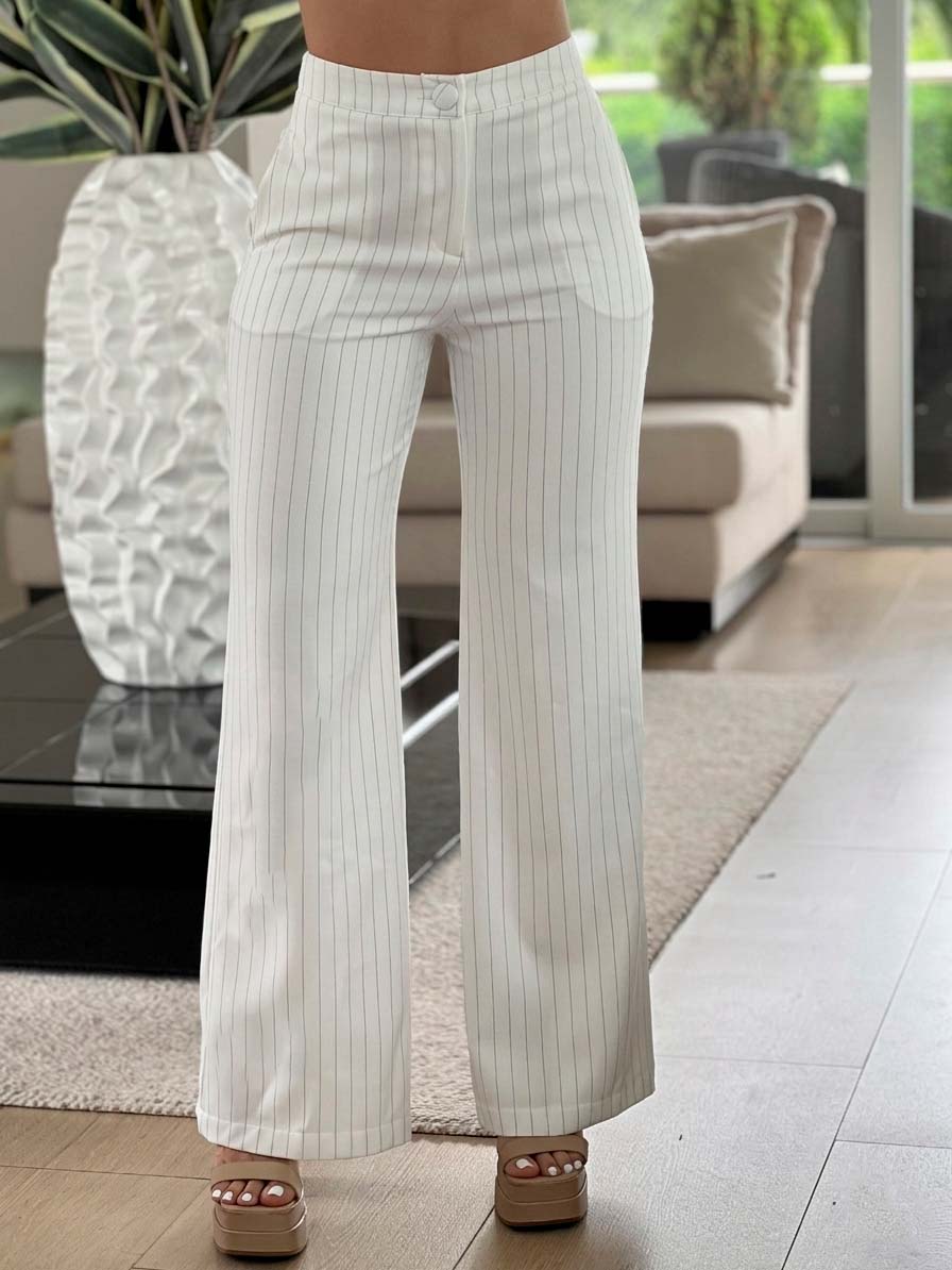Pantalón de tiro alto con silueta amplia y caída fluida que alarga visualmente las piernas. El diseño de líneas verticales aporta estructura y elegancia, mientras que el corte recto mantiene un look cómodo pero muy estilizado. úsalo a juego con la Blusa. Un set monocromático súper elegante que mezcla estilo clásico con un aire moderno, Las líneas verticales estilizan la figura y el conjunto crea un look limpio, sofisticado y muy versátil, ideal para eventos, salidas especiales o para verte impecable sin esfuerzo.