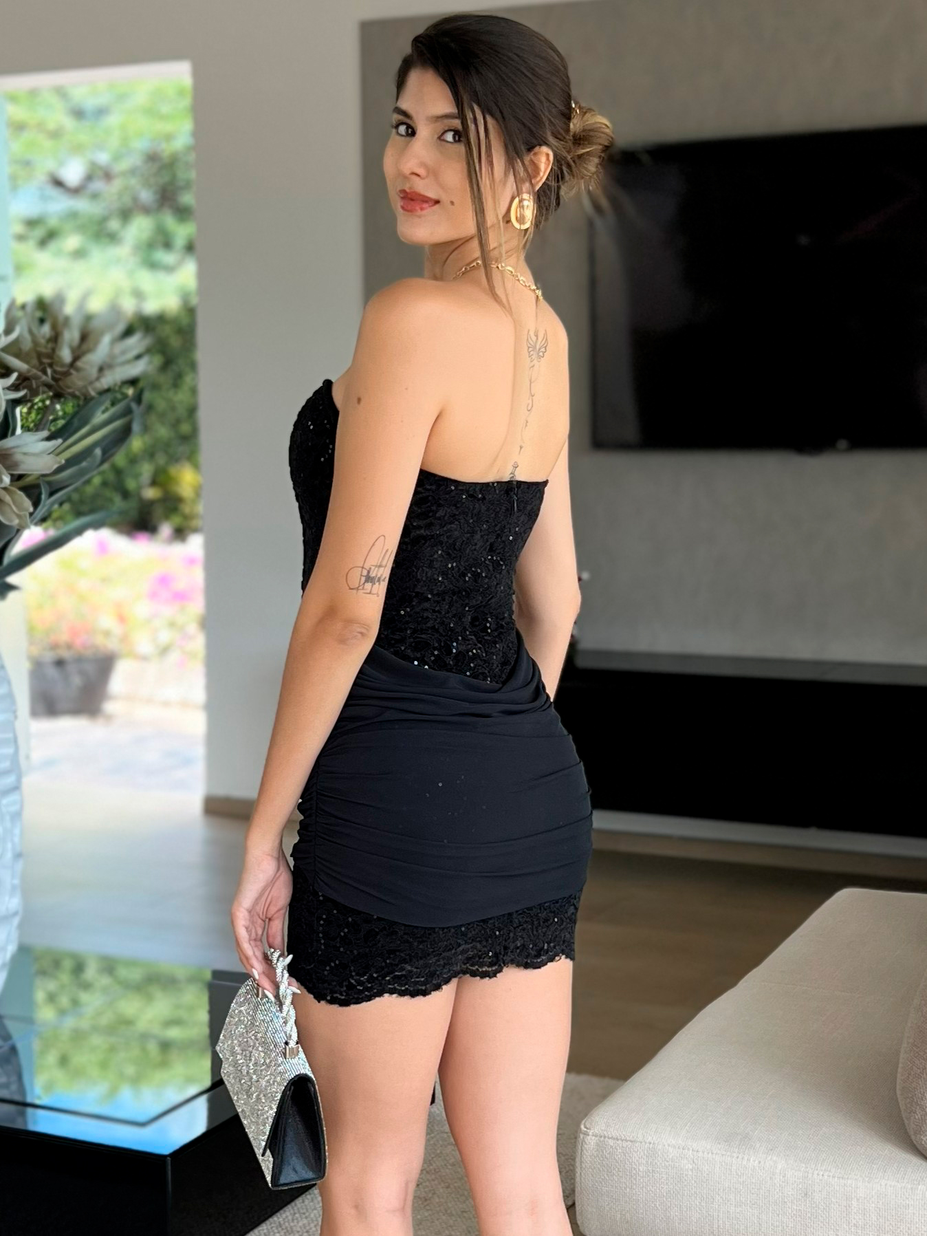 Vestido corto strapless en tono negro, con corsé en encaje y delicados detalles brillantes que le dan ese toque glam sin exagerar. El drapeado lateral estiliza la figura y resalta la silueta, mientras la falda ajustada lo hace súper favorecedor. Es elegante, sensual y perfecto para una noche especial, fiestas o eventos donde el dress code es full sofisticado y con actitud.